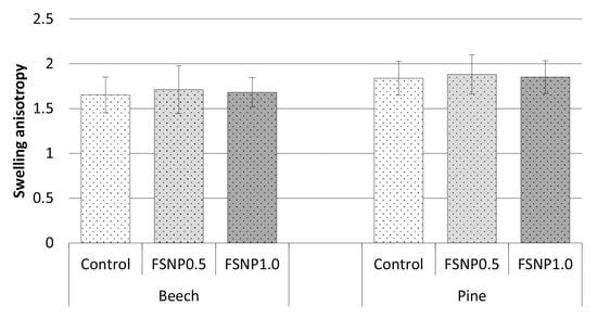 Swelling anisotropy of FSNP-modified beech and Scots pine wood (whiskers showing standard deviation of the results).