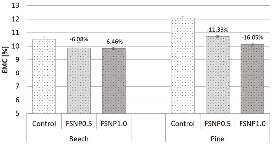 EMC was tested on 10 pieces of 20 × 20 × 5 mm3 (radial × tangential × longitudinal) samples of each treated and control material. The samples’ weight was measured under oven-dry (105 °C) and climatized (t = 20 °C; φ = 65%) conditions. The constant mass was reached in 10 weeks by all test specimens.