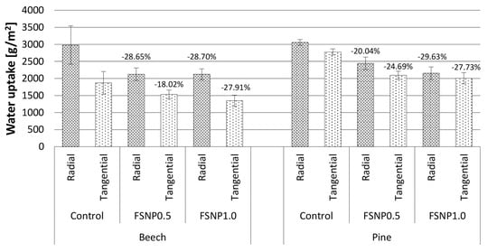 Water uptake of FSNP-treated and untreated beech and Scots pine wood in radial and tangential directions (percentages show the difference to the control and whiskers the standard deviation of the results).