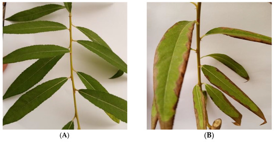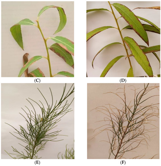 For Salix alba seedlings that were treated with 25% IWW (stressed treatment: S), the appearance of chlorosis and progressive necrotic patches on the edges of the leaf blades were recorded after 6 days (Figure 1B). In addition, preferential downward inclination of the leaves (=epinasty) (Figure 1D) that was accompanied by leaf rolling was observed after six days (Figure 1C). For Casuarina glauca seedlings that were treated with 25% IWW (stressed treatment: S), progressive drying of the needles was recorded beyond day 15 (Figure 1F).