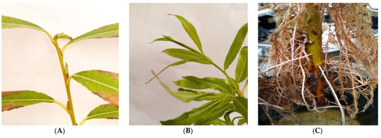 The industrial wastewater (IWW) applied at 25% IWW to S. alba (S, stress) and C. glauca seedlings (S) caused the onset of several symptoms related to the toxicity of metal ions (pronounced chlorosis, progressive necrosis, early senescence and root browning) (Figure 1B–D,F). This adverse effect of heavy metals appears at the whole-seedling level and was attributed to excessive accumulation of Mn, Co, Fe and Na (Table 2), which is associated with physiological disturbances [44] and nutritional imbalance [45]. In addition, leaf rolling in S. alba (S) decreases leaf area and can lead to a decrease in photosynthetic activity [46]. Similar signs were observed in S. viminalis [47]. Moreover, exposure to 25% IWW affected root morphology and caused progressive root browning, leading to a reduction in water and mineral uptake by the roots. Such morphological disturbances could be attributed to a calcium deficiency [48] or to an accumulation of potentially toxic elements, thereby limiting their transport to the leaves [49]. This highlights the premature senescence of older leaves and the appearance of a recovery phase with the emergence of new leaves and white roots, markedly so in S. alba (S) (Figure 2A–C). This response has been reported to be an adaptive strategy following vacuolar sequestration of the most toxic heavy metals [50].