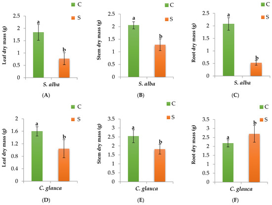 Comparison of leaf (A,D), stem (B,E) and root dry masses (C,F) in seedlings of S. alba and C. glauca treated with tap water (control, C) or with 25% industrial wastewater (25% IWW; stressed, S) after 35 days of treatment, (n = 5, mean ± SD). Different letters above the means indicate a significant difference at p < 0.05 according to Student–Newnan–Keuls (SNK) tests.