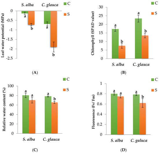 Variation in leaf water potential (A), SPAD value (B), relative water content (C) and chlorophyll fluorescence (D) measured after 12 days in S. alba and C. glauca treated with 25% industrial wastewater (25% IWW; stress, S) or with tap water (control, C), (n = 5, mean ± SD). Different letters above the means indicate a significant difference at p < 0.05 according to SNK tests.