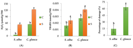 Variation in the concentrations of hydrogen peroxide H2O2 (A), thiobarbituric acid reactive substances (TBARSs) (B) and percentage damage to membrane structures (C) in S. alba and C. glauca treated with IWW (S, stress) or with tap water (C, control), (n = 5; mean ± SD). Different letters above the means indicate a significant difference at p < 0.05 according to SNK tests.