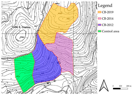 The applied experimental design was the same as suggested by a recent review on the topic [36] which allows for investigating separately the disturbance to the forest soil related to logging operations and silvicultural treatment. In the three harvested cutting blocks, the soil was divided into two different portions: the soil affected by mule passage (disturbed soil–DIST) and the soil in which the silvicultural treatment was applied but no animal passage was detected (low disturbance soil–LD). In the disturbed soil it is possible to assess the disturbance directly related to logging operations, while in the low-disturbance soil, only the disturbance related to the silvicultural treatment which was applied (in this case coppicing with 120 standards per hectare) was assessed. A further unharvested cutting block was used as a control area (CON). Applying the same design to cutting blocks harvested in different years allowed for the evaluation of the recovery process of soil features. Therefore, the experimental design presented seven experimental treatments (CB-2019 DIST; CB-2019 LD; CB-2014 DIST; CB-2014 LD; CB-2012 DIST; CB-2012 LD, and CON).