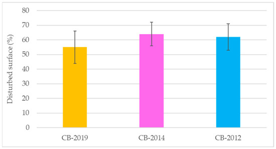The percentage of disturbed soil in the three investigated cutting blocks was 60% on average, ranging from 55% in CB-2019 to 64% in CB-2014. However, no statistically significant difference was detected among the values of the disturbed surface among the three cutting blocks, as reported in Figure 2.