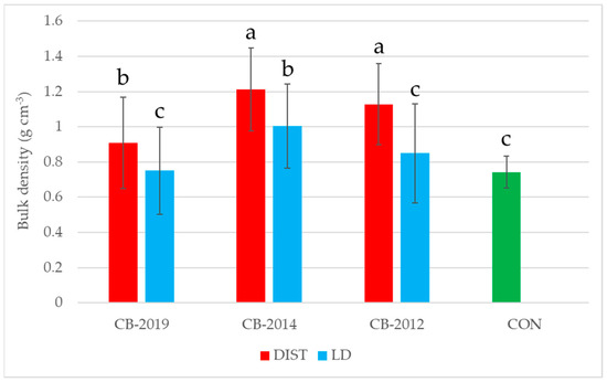 The one-way ANOVA revealed the presence of statistically significant differences among the values of bulk density in the experimental treatments (Figure 3). Bulk density in the low-disturbance soil was significantly higher than the control values only in the cutting block CB-2014, while no differences were detected for CB-2019 and CB-2012. On the other hand, the soil affected by mule passage showed significantly higher values of bulk density in comparison to the control area, with a significant increase of 19% in CB-2019 and an even higher soil compaction was detected in CB-2014 and CB-2012 with an average increase of about 36%.