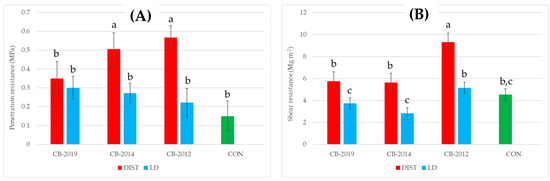 Statistically significant differences were also detected regarding the values of soil penetration and shear resistance (Figure 4a,b, respectively), with the two variables showing a similar trend. Interestingly, a significant increase in penetration resistance was shown only in the mule trails in CB-2014 and CB-2012, while for shear resistance, an increase was shown only in the disturbed soil in CB-2012. It seems, therefore, that soil compaction in terms of penetration and shear resistance did not change significantly in a short time after logging, but tended to grow after a longer period. No significant alteration was instead detected concerning the values in the low disturbance soil not affected by the passage of the mules.