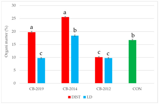 A statistically significant alteration was also revealed by one-way ANOVA for the values of soil organic matter in the various experimental treatments (Figure 5). Differently from what was shown for the other physicochemical variables, it seems that also the silvicultural treatment applied, i.e., coppicing with standards, can significantly decrease soil organic matter. Indeed, the obtained data revealed a statistically significant decrease in CB-2019, which is not recovered in CB-2012. Organic matter in the mule trails showed instead a particular trend, increasing significantly after logging but rapidly decreasing until reaching values significantly lower than the control ones in CB-2012.
