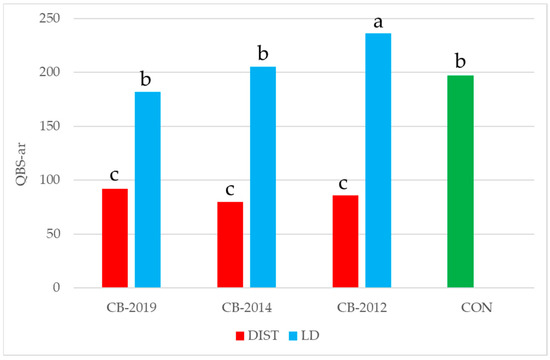 Values of QBS-ar index in the various experimental treatments. Different lowercase letters indicate different homogeneous groups (p < 0.05) according to the Duncan test. Green color refers to control area.