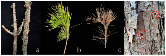 External symptoms of pine trees infected with B. xylophilus. (a). Beetle feeding wound; (b). Needle discolouration; (c). Needle wilting; (d). Red circle indicates vector beetle oviposition scars.