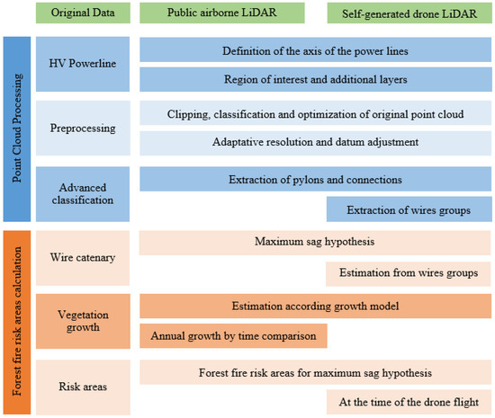 Figure 1 shows the process workflow, outlining the steps to be followed for each module. It should be noted that processes applied to both datasets (public LiDAR data, self-generated drone LiDAR data) are similar, with the particularity that the drone LiDAR data provides higher spatial resolution, so it is possible to apply some advanced processing to refine the results obtained. In addition, more precise and reliable results can be obtained regarding the state of the power line and the vegetation at the time of the drone flight.