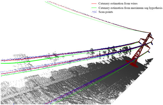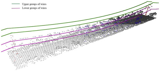 The real catenary estimation from point cloud data can only be calculated using self-generated drone LiDAR data, since the classification in wire groups described in Section 2.2.3 is necessary. In this way, all points included in the “wire” class are used to estimate its 3D geometry (Figure 3). This estimation corresponds to the real catenary geometry for each wire group at the time of drone flight, that is, with the corresponding load and tension conditions and different from the theoretical catenary calculated based on the maximum sag hypothesis. For the real catenary estimation, the algorithm combines least squares adjustment with RANSAC to fit a curve to the classified point cloud of each wire group.