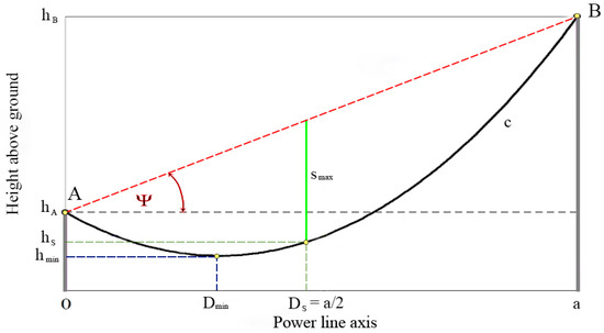 Catenary estimation based on the maximum sag hypothesis with the anchor points at different levels. A and B correspond to the anchor points of the wire to the insulators; Ψ is the angle of inclination between the two points; c is the wire catenary; smax corresponds to the maximum sag; hmin is the minimum height of the wires above the ground according to the design standards.