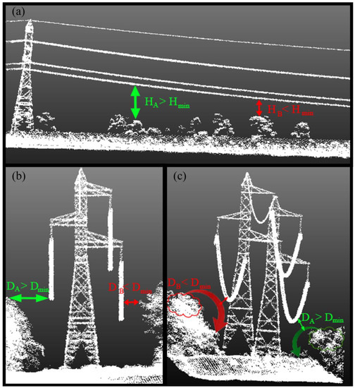 Geometric criteria for defining risk areas: (a) Height risk; (b) Distance risk; and (c) Fall risk. Hmin and Dmin correspond to the minimum heights and distances to the vegetation according to the regulations in each country. DA (green) represents a valid distance, while DB (red) represents a non-valid distance and thus a risk area.