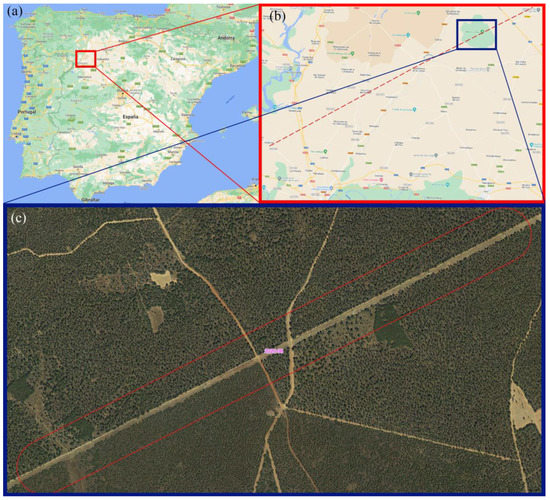 Study area to validate the proposed methodology. (a) Location map in Spain; (b) situation of the power line in the province of Zamora (Spain); (c) selected area for the drone flight.