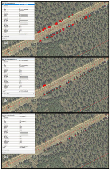 - Seventy-three risk areas were obtained based on the fall risk (i.e., when the distance of the fallen vegetation is less than 4.2 m [2]). The total area was 1808 m2, and the average area of each zone was 24.8 m2, so in this case these risk areas corresponded to small and isolated zones. The minimum distance ranged from 0 m (i.e., case where the vegetation would touch the wire) to 3 m. This case represents a higher risk than the other two, since the number of areas considered and the lower distance values were significant. In any event, this risk will be conditioned on the fall of the vegetation.