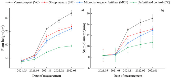 Growth rhythms of height and stem diameter of “Qi-Nan” agarwood seedlings under different bio-organic fertilizer treatments. (a) plant height; (b) stem diameter. No fertilizer (CK); vermicompost (VC); sheep manure (SM); microbial organic fertilizer (MOF). The bars are means ± standard error.
