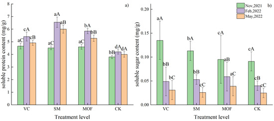 Figure 2b shows the effects of four fertilization treatments on soluble sugar (SS) in “Qi-Nan” agarwood seedlings. In November 2021, February 2022, and May 2022, there were significant differences among the SS groups of “Qi-Nan” agarwood seedlings (p ≤ 0.05), and all groups showed a decreasing trend with time. In November 2021, the VC group was the best, as it increased by 48.35% compared to the CK group. In February 2022 and May 2022, the MOF group was the best, as it increased by 47.50% and 56.00% compared with the CK group.