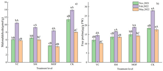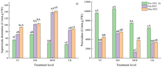 In November 2021, February 2022, and May 2022, there were differences in the superoxide dismutase activity (SOD) content among groups (p ≤ 0.05) (Figure 4a), and all groups showed an increasing trend with time. In November 2021, the SM group was the best, increasing by 73.66% compared with CK. In February 2022 and May 2022, the MOF group was the largest, rising by 64.01% and 60.78% compared with the CK group.