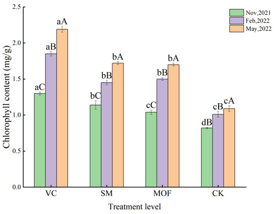 Effects of different bio-organic fertilizer treatments on chlorophyll content of “Qi-Nan” agarwood seedlings. No fertilizer (CK); vermicompost (VC); sheep manure (SM); microbial organic fertilizer (MOF). Capital letters represent significant differences at the 0.05 level (p ≤ 0.05) for the same treatment and different periods, and lowercase letters represent significant differences at the 0.05 level (p ≤ 0.05) for the same period and different treatments.