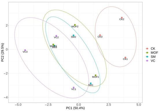 Principal component analysis of “Qi-Nan” agarwood seedlings under different fertilizer treatments: No fertilizer (CK); vermicompost (VC); sheep manure (SM); microbial organic fertilizer (MOF). The number represents the measured value in different periods, where 1 represents the measured value in November 2021, 2 represents the measured value in February 2022, and 3 represents the measured value in May 2022.