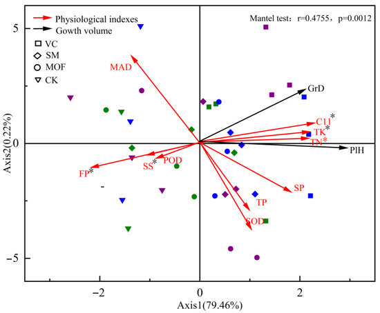 It can be seen from the angle between the indicators that, in growth indicators, PlH and GrD are positively correlated with Chl, TK, and TN and negatively correlated with MDA, Pro, SP, and POD. In physiological indicators, SP, SOD, and MDA were negatively correlated. In nutrient indicators, TN and TK were positively correlated with each other, while TP and MDA were negatively correlated.