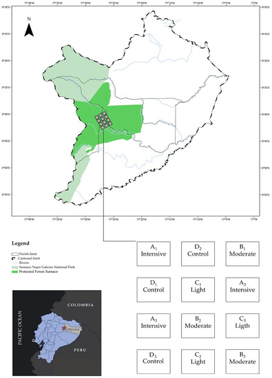 A randomized complete block design with three replications was used. The target variables were growth rate of diameter at breast height (DBH) and basal area. Figure 1 shows the spatial distribution of plots into the Sumaco Protected Forest (Figure 1). The plot network covered a 1.0 × 0.5 km (300 m northbound and 100 m east and westbound) land area. The plots’ dispersion is explained by the search for the most homogeneous plots possible as an agroforestry system as described above. The twelve square field plots, 400 m² each with a net plot size of 324 m2, were established within this area [23,24,25,26]. Three thinning levels were applied: control (D plots, no thinning was done); light thinning (C plots, low thinning affecting low-diameter trees); moderate thinning (B plots, restrained thinning affecting low- and medium-diameter trees); and intensive thinning (A plots, affecting some codominant and high-diameter trees). The plot distribution in each of the thinning levels plots was the centre of the identified agroforestry system.