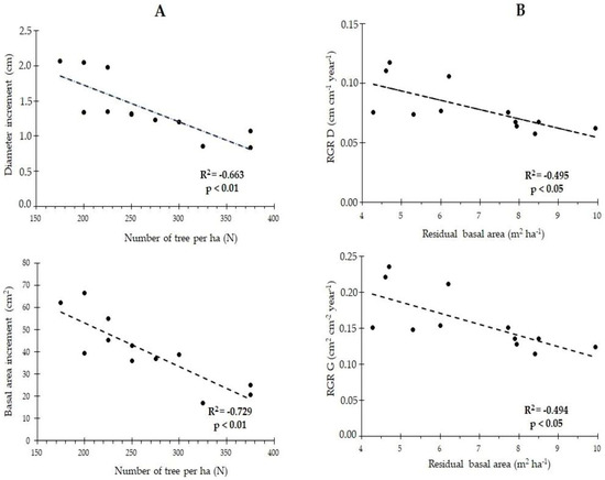 Absolute growth in DBH and basal area was significantly correlated with the number of trees per hectare, N (Figure 2A), whereas relative growth in DBH and basal area was significantly correlated with G (Figure 2B). Linear regression equations had similar fit and were more efficient than quadratic equations to estimate growth rate in DBH and basal area, both in absolute (Table S2) and relative (Table S3) terms, from number of trees (N), respectively. Standard errors of parameters estimated in the linear model were much smaller.