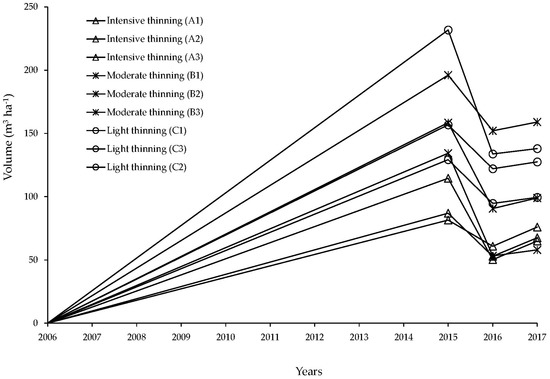 Figure 3 shows the volume evolution of laurel trees in thinning plots for the 2006–2017 period. High statistical significance (p < 0.001) was detected for volume (m3 ha−1) in 2017 after treatments. Tukey’s 5% multiple comparison test classified the means into two ranges. The first was for intensive thinning with a mean increase of 14.3 m3 ha−1.