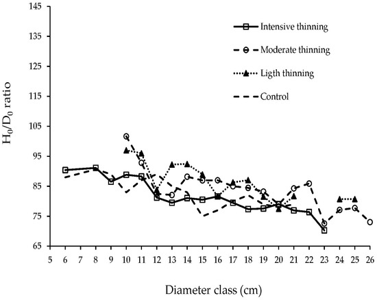 The trend of Ho/Do ratios per diameter class in residual trees after applying the thinning treatments shows the large heterogeneity of tree structure in these stands generated from natural regeneration (Figure 4). Trees with a high Ho/Do ratio in all diameter classes were eliminated with the intensive thinning.