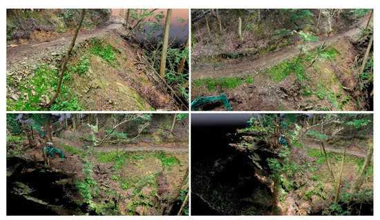 Although SfM analysis using UAVs is used for constructing forest road network, previous studies have used data obtained from locations higher than the tree canopy. In the SfM analysis, identifying the same object in images taken from multiple locations is necessary. The ground surface in forests cannot be photographed due to the obstruction caused by standing trees. Therefore, flying the UAV under the tree canopy is necessary for performing a detailed analysis of the changes in the amount of earthwork during construction. An automatic flight is difficult under the tree canopy, as stable global navigation satellite system (GNSS) reception and positioning accuracy cannot be ensured. Consequently, manual operation with advanced flight techniques is required in such conditions. Therefore, few studies have been conducted by flying UAVs under the canopy to obtain detailed information of forests [30,31].