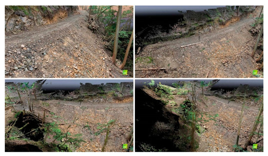 The 3D models of each phase were successfully constructed using SfM analysis. The resolution of the generated models ranged from 1.1 cm to 1.4 cm. For example, the 3D models generated from the data taken before, during, and after the work was completed and viewed from various angles are shown in Figure 1, Figure 2 and Figure 3.