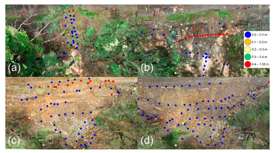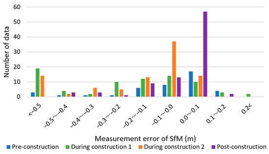 The overall measurement error averaged −0.146 m, leading to a general tendency toward underestimation. The RMSE was 0.098 m, indicating that elevation values could be obtained with an accuracy of about 10 cm. However, the average error varied greatly from one measurement session to the next. It was −0.102 m before the repair work, and −0.259 m and 0.198 m during the repair work, whereas it was −0.017 m after the repair work, a significant improvement. Lee and Lee [28] reported an RMSE error of 0.11 m in the vertical direction for the SfM analysis using vertical and 45-degree photographs from 50 m altitude at a construction earthwork site. The error in this study was similar, but the accuracy in this study was slightly less at closer distances to the ground surface and in forest areas.