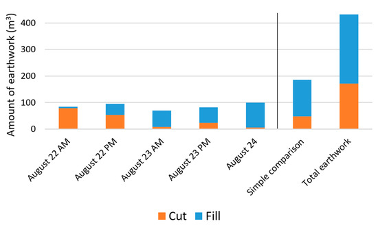 It was suggested by these results that SfM analysis is sufficiently accurate for soil volume calculations in units of cubic meters. However, there was room for further study on the accuracy of measurements under subsoil vegetation and at sharp slope conversion points. Therefore, we calculated the amount of earthwork for cut and fill at each stage. The results are shown in Figure 6.