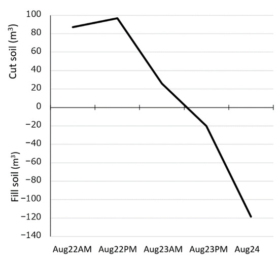 The cumulative earthwork volume at each stage is shown in Figure 7. The rate of change in the volume of loosened soil, the change in the volume of soil in the excavation of the ground soil volume (L), was calculated as 1.2 in calculating the amount of earthwork. The rate of change in the volume of compacted soil and the difference in soil volume in forming the ground soil volume into fill (C) was 0.9. The volume of the log structure embedded in the fill was not considered.