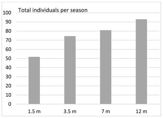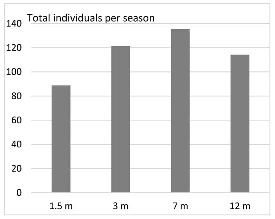 In deciduous forests, the highest cumulative Lepidoptera abundance for the season was at 12 m, the lowest at 1.5 m (Figure 2). At other heights, abundance values were intermediate.