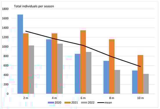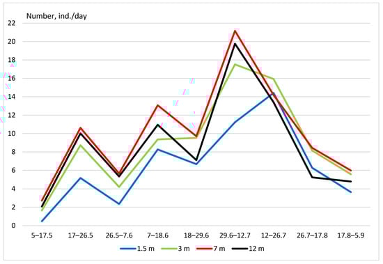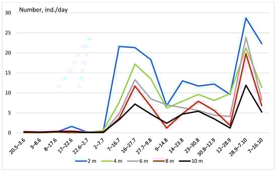 In contrast to forest ecosystems, in open habitats, the number of Lepidoptera had a completely different character at various heights. According to the studies of 2020–2022, the average number of Lepidoptera was higher at the 2 m height during the whole period of observations. The lowest number of Lepidoptera was found in the highest trap at 10 m. At other heights, abundance was intermediate (Figure 6).