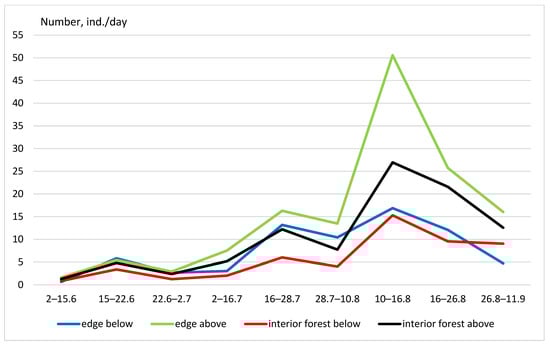 Seasonal population cycles are well known for most insects [40,65,66,67]. In Lepidoptera, such cycles are known and are associated with seasonal changes in temperature, day length, humidity, and other factors. In tropical ecosystems, seasonal cycles depend on the mix of rainy and dry seasons [68,69,70,71], while in temperate forests seasonal variability is influenced by photoperiod and temperature [72,73,74]. In our study, the seasonal dynamics of Lepidoptera abundance were well defined. Lepidoptera flight activity had two or three peaks in forest ecosystems at all heights. In May–June, the first Lepidoptera appeared: their caterpillars wintered or appeared in spring. A second population maximum was obtained in July. At this time, many adult Lepidoptera are actively attracted to baits with fermented beer and sugar. The Noctuidae, Geometridae, Erebidae, Thyatiridae, and other families usually fly to these lures [47,50,75,76]. However, the general trend shows an increase in trap numbers in the second half of summer and autumn, while numbers in spring are very low. An interesting trend emerged where, in canopy habitats (pine and deciduous forests), the maximum abundance peak occurred in mid-July and September, respectively. However, in open habitats (glades), the maximum abundance was obtained in late September–early October. It is likely that this maximum abundance is related to the migration of Lepidoptera from forest habitats, where temperatures are lower at this time, to open habitats with apparently higher solar insolation and higher air temperatures [77]. Perhaps, nectar sources are also declining in the closed forest canopy. In addition, the temperature and food sources attract adults into the open areas.