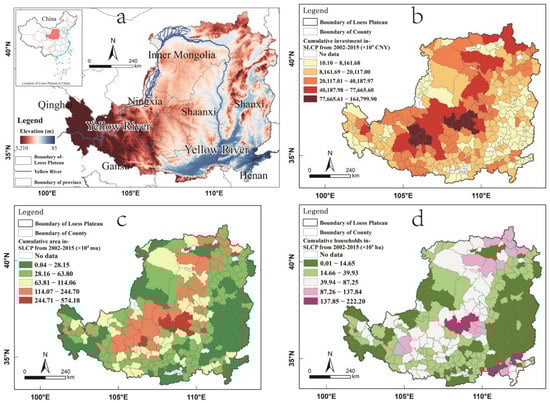 Figure 1. (a) Location and topography of the LP; (b) cumulative investment in SLCP; (c) cumulative area in SLCP, and (d) cumulative households in SLCP, 2002 to 2015.