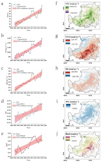 Figure 3. Variation of (a) VFC, (b) VCS, (c) SR, (d) WC, and (e) Biod from 2002 to 2018; (f) VFC, (g) VCS, (h) SR, (i) WC, and (j) Biod have changed significantly (p < 0.05) from 2002 to 2018.