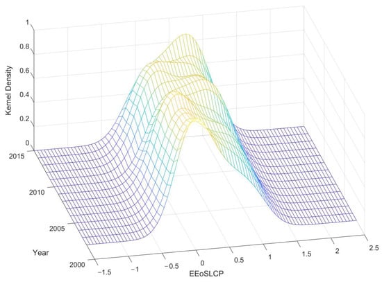From the distribution pattern, the overall distribution curve of EEoSLCP on the LP shows the evolution pattern of “two peaks standing side by side” composed of “one main peak plus one side peak”. It shows that the EEoSLCP in each county of the LP is always in the pattern of polarization during the study period and the eco-efficiency of some counties is concentrated at a higher level, while that of other counties is concentrated at a lower level. From 2002 to 2015, the evolutionary dynamics of the main peak height showed an overall decrease over time and an increase in the width of the main peak, indicating that the absolute gap in efficiency tends to widen in counties clustered at a lower level of EEoSLCP. The evolution of the height of the lateral peaks shows an overall increase over time and a gradual decrease in width, indicating that the absolute difference in efficiency tends to decrease in counties clustered at a higher level of EEoSLCP.