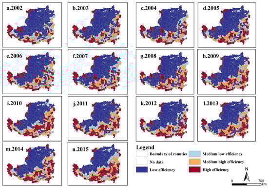 From the number of counties divided into efficiency status intervals (Appendix A, Figure A1), the number of counties with low EEoSLCP showed a fluctuating downward trend, from 161 in 2002 to 76 in 2015, mainly concentrated in the southeastern part of the LP, and the range of counties with low efficiency shrank from southeast to northwest year by year. The number of counties with high efficiency and medium efficiency showed a fluctuating upward trend, from 60 and 35 in 2002 to 114 and 69 in 2015, respectively, mainly located in the central and eastern regions of the LP. The number of medium–low efficiency counties shows a stable and unchanging trend, basically stable at about 50.