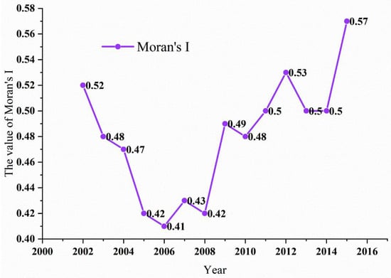 Figure 7. Global Moran’s I of the EEoSLCP, 2000 to 2015.