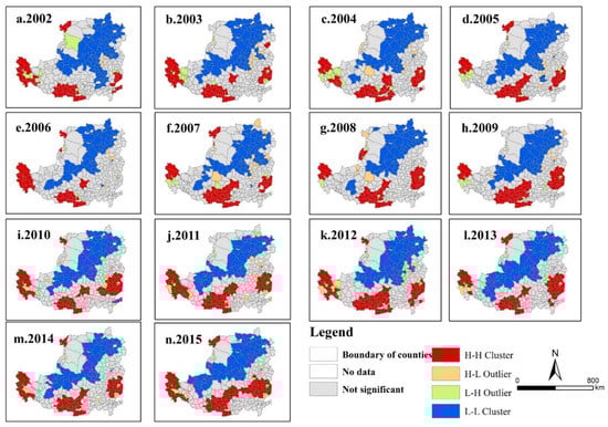 H-H clustering, which indicates that, if a county has high EEoSLCP, then its neighboring counties also have high efficiency, mainly concentrated in the western, southern, and eastern regions, which is a high level of the spatial equilibrium associated agglomeration state of “high in the center and high around”. The number of H-H in 2002 to 2015 showed an overall fluctuating upward trend in time and, in space, it showed that the range of the H-H clusters in the west remained basically unchanged, while the H-H clusters in the south expanded and spread to the north and northeast, and the H-H clusters in the southeast corner region expanded and spread to the south and to the west.