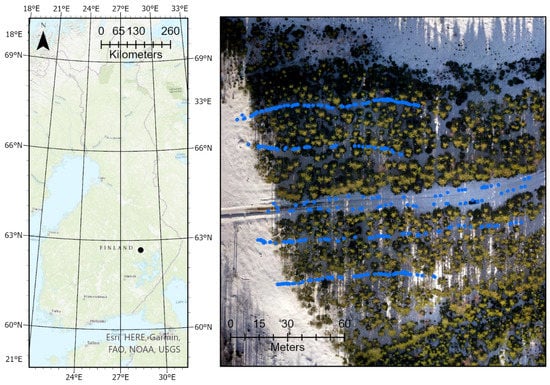 The double-grid flight pattern was employed using a consumer-grade UAV (DJI Mavic 2 Pro, Shenzhen, Guangdong, China) equipped with a Hasselblad L1D-20c RGB camera. The flights had an 80% overlap, 70% sidelap, and a camera angle of 90 degrees. The flight was automated using the Pix4Dcapture application. The unmanned aerial vehicle (UAV) data were processed in Agisoft Metashape Professional software [] using a structure-from-motion (SfM) workflow, which is a photogrammetric technique for estimating three-dimensional structures from two-dimensional image sequences. The images were aligned, and the GCP coordinates were imported from TOPODRONE Post Processing []. We performed bundle adjustment in the selected coordinate system (EPSG::3903: ETRS89/TM35FIN(N,E) + N2000 height) and built a dense point cloud with default values of “Ultra high quality” and “mild” depth filtering. The total error of the image block georeferencing was 7.76 cm. The spatial resolution of the digital surface model (DSM) was 2.7 cm. Points were classified as either “ground” or “other”; then, the digital elevation model (DEM) and the DSM (Figure 3) were constructed. Further, subtracting the DEM from the DSM allowed the canopy height model (CHM) to be calculated.
