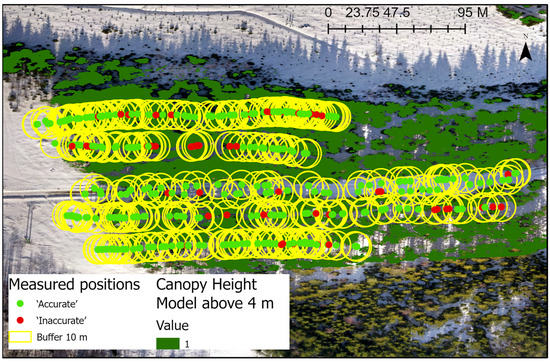The impact of canopy cover on the positional accuracy of the Trimble R12 was evaluated using a CHM. The CHM was reclassified to exclude pixels located below the Trimble R12 by using the height of the harvester roof as a reference (Figure 5). The results show that the mean canopy cover was higher for ‘Inaccurate’ points than for ‘Accurate’ points (Table 3). However, there were points that were correctly positioned even with the presence of a high level of canopy cover (86%).