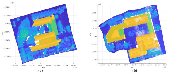 Vegetation and building point clouds. (a) Plot 1; (b) Plot 2.