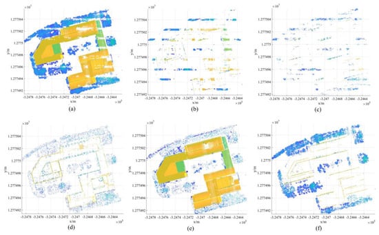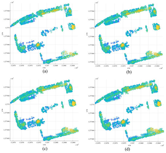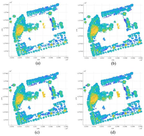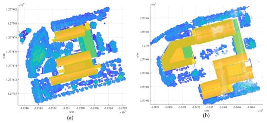 The results presented in Figure 6 and Figure 7 indicate that more complete vegetation extraction results can be obtained for higher R values, while the code’s runtime increases. When R = 0.6 m, both plot 1 and plot 2 can obtain better vegetation extraction results, and many building point clouds have been eliminated, except for some building boundary point clouds. Therefore, considering both the vegetation extraction results and the code operation efficiency, this research selects R = 0.6 m as the best value for experiments. When R = 0.6 m, the vegetation point cloud extraction results of the two plots are as shown in Figure 6c and Figure 7c, and the building point cloud results extracted from the two plots based on plane features are as shown in Figure 8.