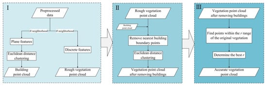 Technology roadmap. (I) Rough extraction of vegetation point cloud and building point cloud; (II) Removing the building boundary point cloud in the vegetation point cloud; (III) Accurate extraction of vegetation point cloud.